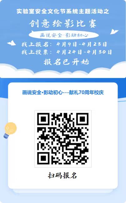 为强化全院学生的实验室安全意识,创新安全教育形式,将严谨的安全规范与活泼的创意表达相结合,特启动首届实验室安全文化节,并举办“画说安全·影动初心”献礼70周年校庆创意绘影比赛。旨在引导学生主动关注、思考并传播实验室安全知识,营造“人人讲安全,事事为安全”的校园文化氛围。以扎实的安全行动守安全底线,为70周年校庆添彩。